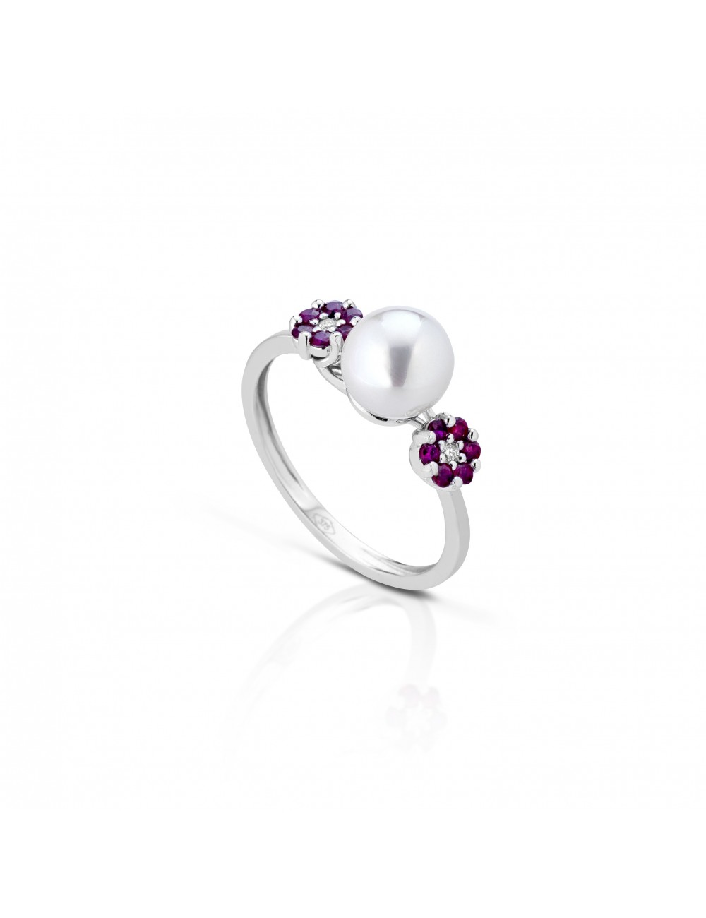 Anello in oro bianco 9kt con rubini, diamanti e perle naturali dal design unico ed elegante perfetto per ogni occasione.