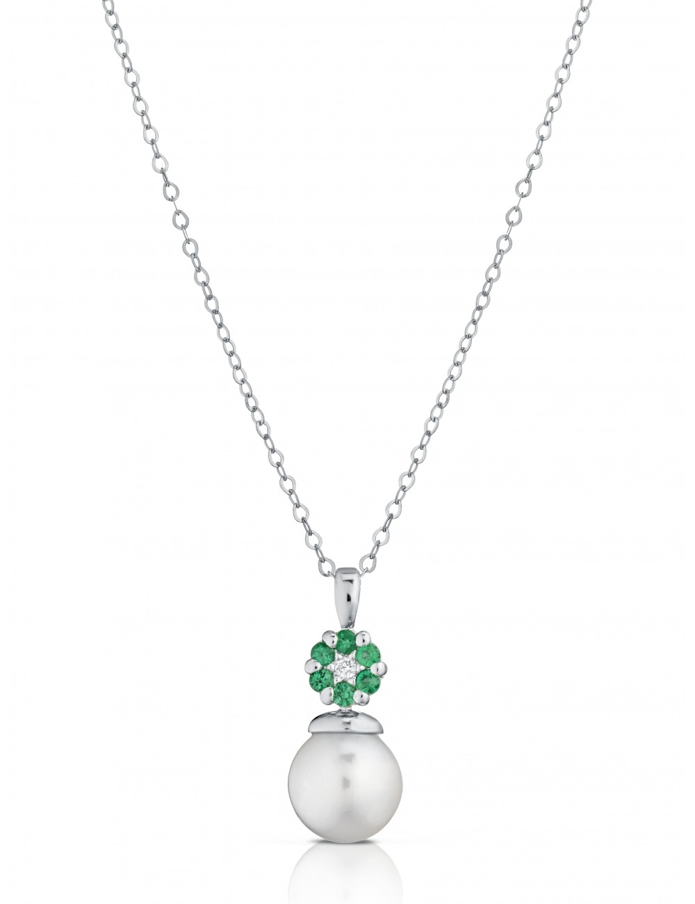 Collana in oro bianco 9kt con smeraldi, diamanti e perle naturali dal design unico ed elegante perfetto per ogni occasione.