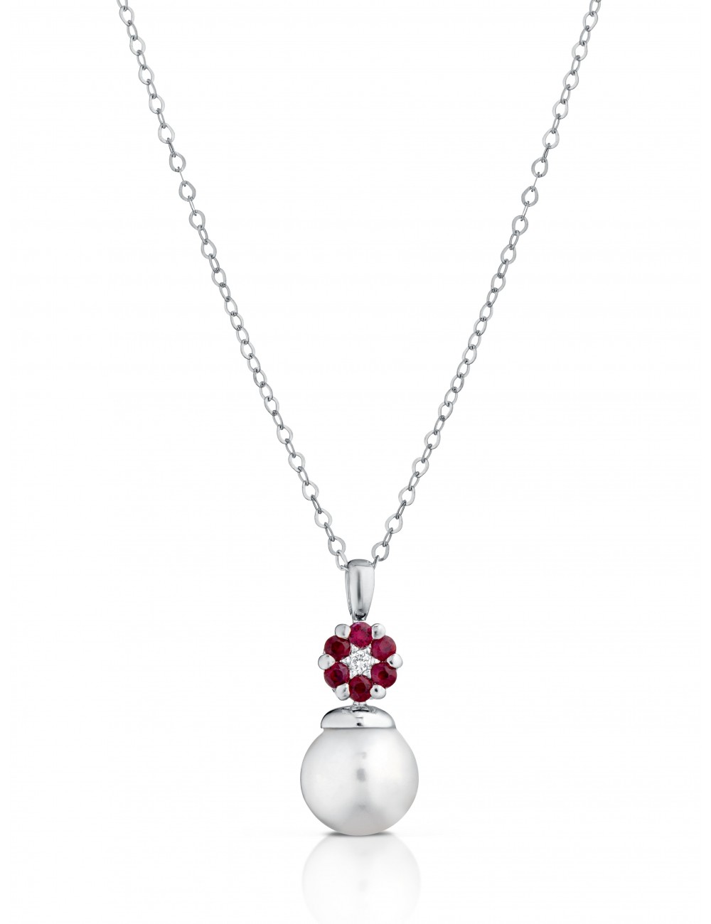 Collana in oro bianco 9kt con rubini, diamanti e perle naturali dal design unico ed elegante perfetto per ogni occasione.